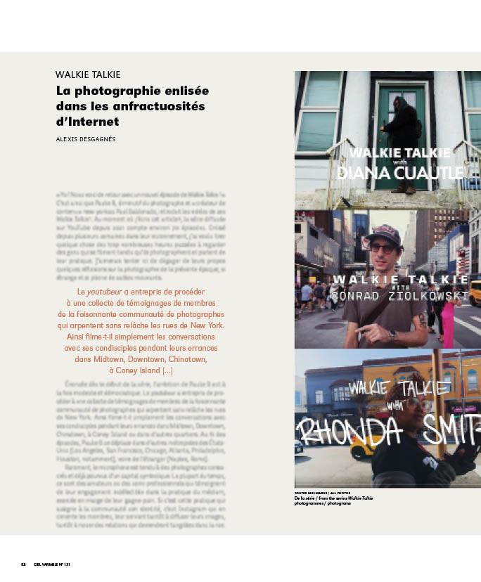 Alexis Desgagnés, « Walkie Talkie, La photographie enlisée dans les anfractuosités d’Internet », Ciel variable, nº 131, « Collectionner », Montréal, 2026, p. 52-59
