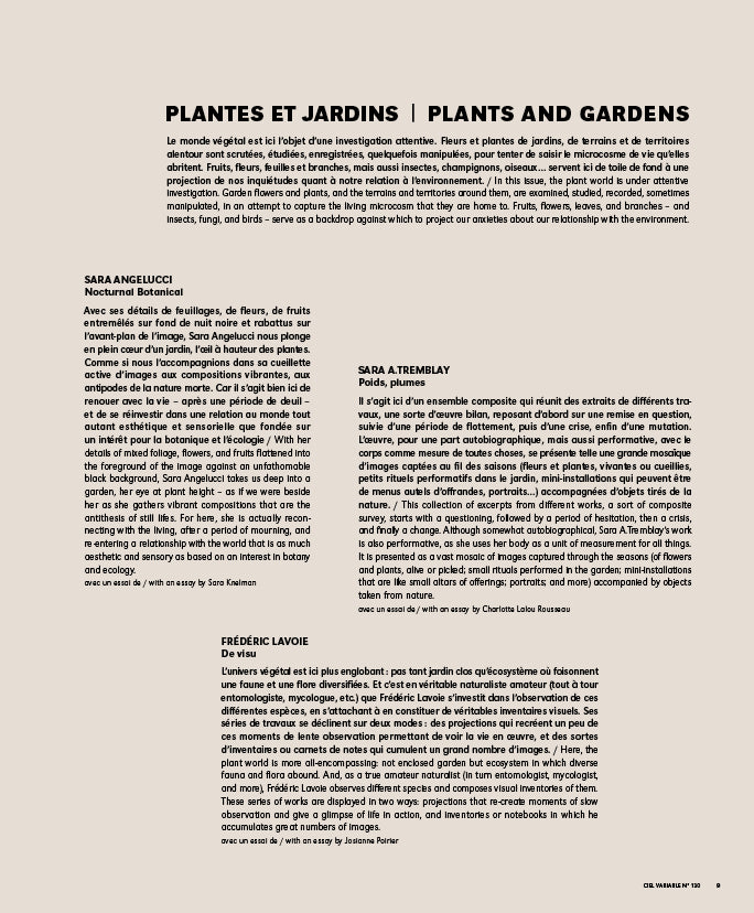 Intitulé Plantes et jardins, le dossier thématique met en lumière les livres de trois artistes — Sara Angelucci, Sara A.Tremblay et Frédéric Lavoie — dont les œuvres photographiques explorent le monde végétal et les espèces qui l'animent avec une attention toute particulière.
