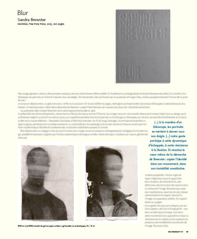 Série présentée d’abord sous forme d’exposition, Blur de Sandra Brewster fait ressortir, comme livre-objet, la dimension tactile et mouvante des images. « À la manière d’un folioscope, les portraits se mettent à danser sous nos doigts, écrit Safia Belmenouar. [C’est] le cœur même de la démarche de Brewster : capter l’identité dans son mouvement, dans son instabilité constitutive. » Marqué par les accidents d’impression et l’absence de netteté, l’ensemble se présente comme un acte de résistance face aux représentations imposées par l’histoire coloniale.