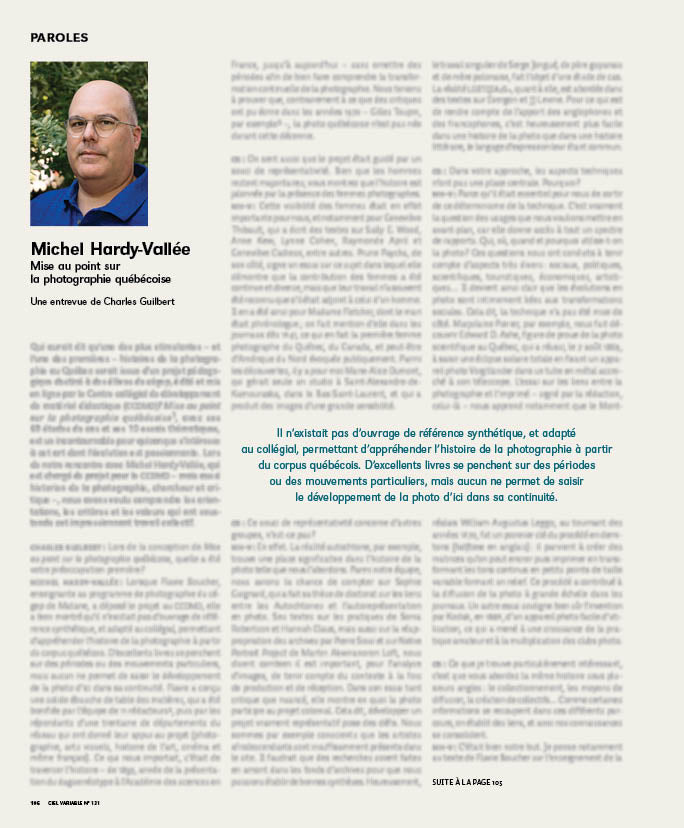 Charles Guilbert, « Michel-Hardy Vallée, An interview by Charles Guilbert, Mise au point sur la photographie québécoise », Ciel variable, nº 131, « Collectionner », Montréal, 2026, p. 103-106.